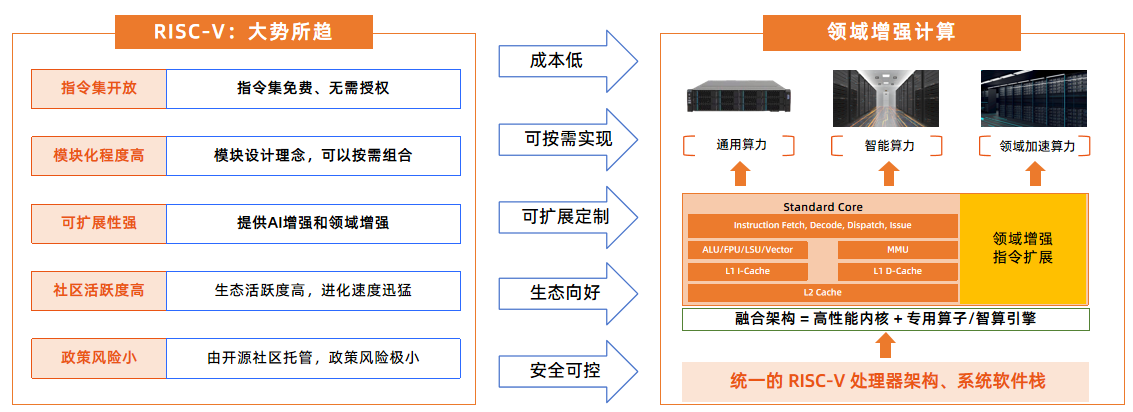 RISC-V架构凭借与生俱来的开放、模块化、可扩展与可定制特性,成为承载领域增强计算的理想载体。相应地,基于RISC-V的CPU内核也成为实现”融合计算“架构的关键基石。然而,当前RISC-V产业整体呈现"低端繁荣、高端稀缺"的格局。在物联网、智能穿戴、嵌入式等成本敏感型市场,RISC-V已取得显著成功。但在数据中心、人工智能、具身智能、自动驾驶等高端计算场景中,高性能RISC-V产品十分稀缺。这不仅制约了RISC-V产业价值的提升,也限制了融合计算架构在泛在智能时代更广泛领域的创新发展和应用落地。