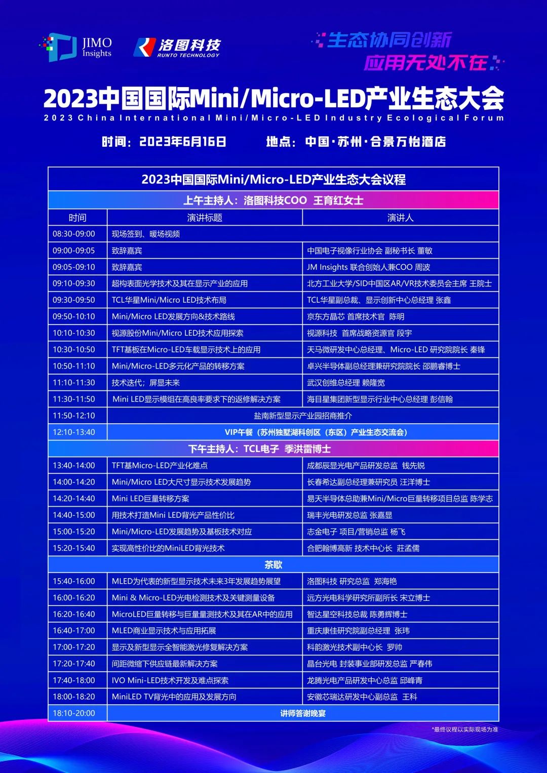 LED产业生态大会将于2023年6月16日在苏州合景万怡酒店召开。最终议程如下: