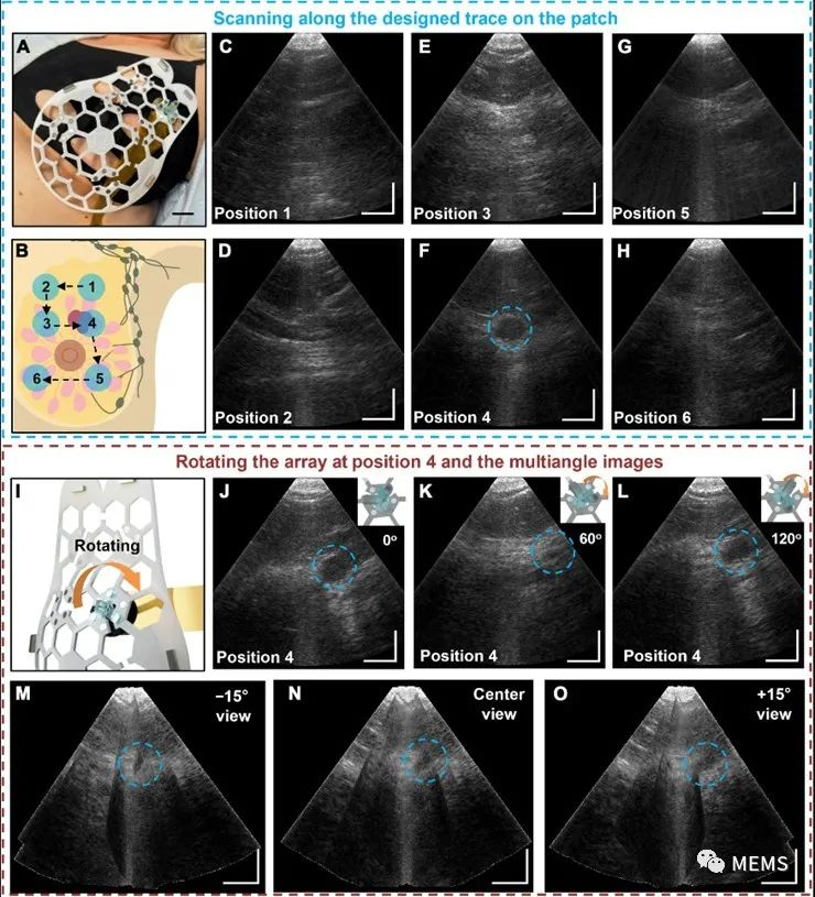 这项研究所开发的用于乳腺组织扫描和成像的超声技术,为跟踪软组织的实时动态变化提供了一种新型非侵入性方法。在实际应用中,cUSBr-Patch还具有多个关键优势,例如可重复使用、易于操作,以及在病变尺寸小于2 cm的早期阶段可在家中实现对乳房异常的连续监测。对于大面积成像而言,个人用户可以将相控阵沿着蜂窝状贴片移动到不同位置以获得全方位的成像。在医院中,医护人员则可以同时使用多个相控阵,通过多角度图像重建实现时空精准的成像。