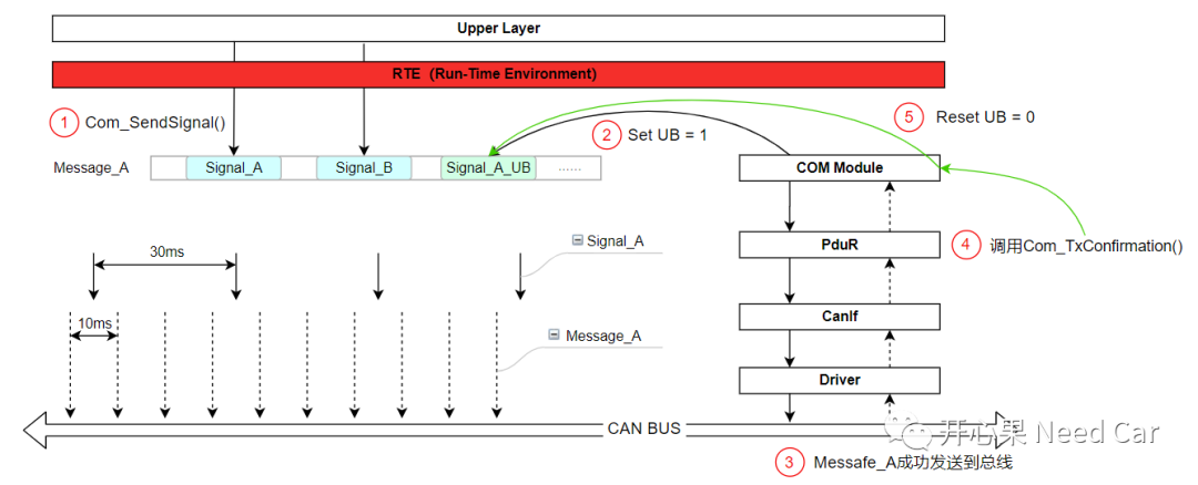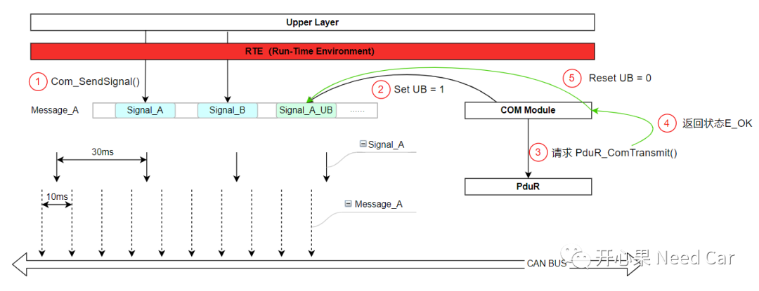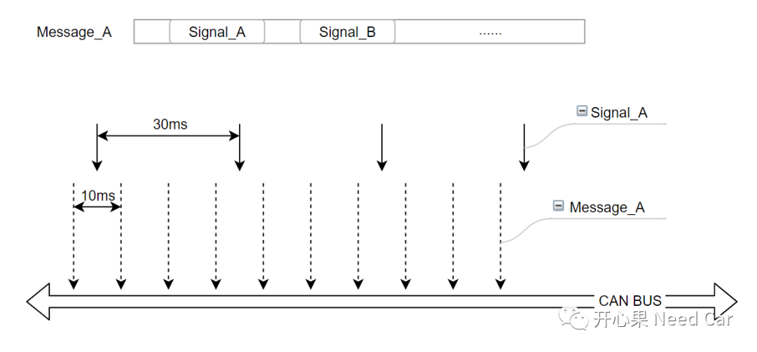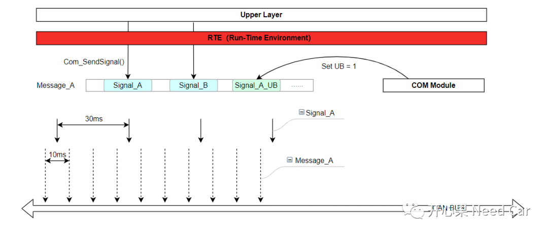 为什么需要用UB位表示Signal/Signal Groups的数据有没有更新呢?假设如下场景,报文Message_A包含信号Signal_A、Signal_B等,Message_A的发送周期为10ms,而Signal_A的更新周期为30ms,示意如下: