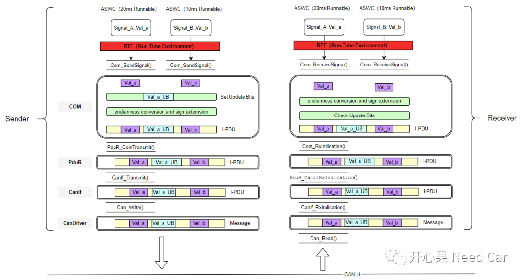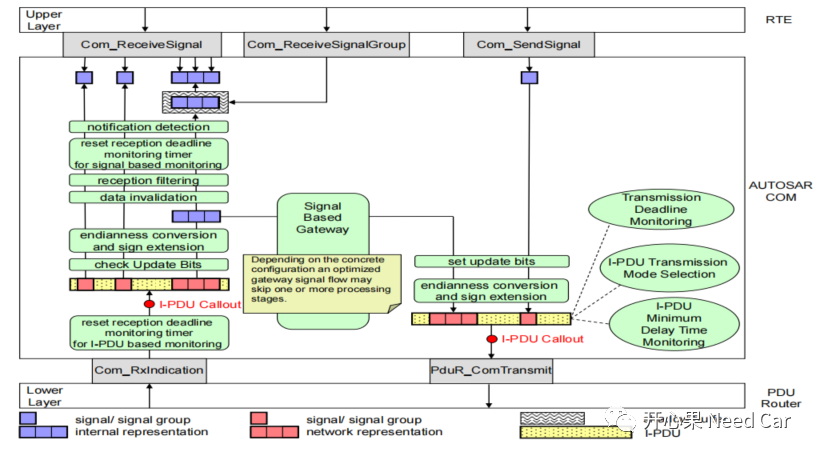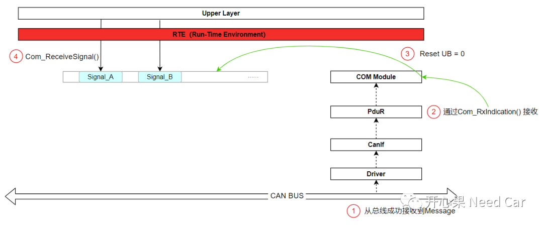Receiver成功从总线接收到目标Message以后,驱动层通过Callback层层向上通知,直到COM模块收到Message,PduR模块通Com_RxIndication()接口将数据通知COM某块,示意如下: