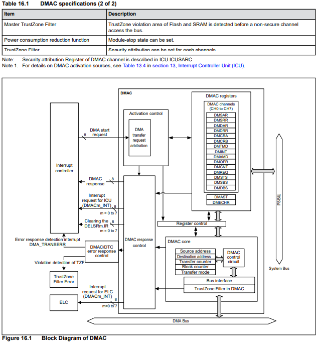 每个DMAC通道在每次完成数据传输或块数据传输时,都会输出一个事件链接请求信号(DMACn_INT)。