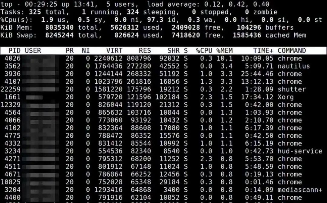 htop命令显示了每个进程的内存实时使用率。它提供了所有进程的常驻内存大小、程序总内存大小、共享库大小等的报告。列表可以水平及垂直滚动。