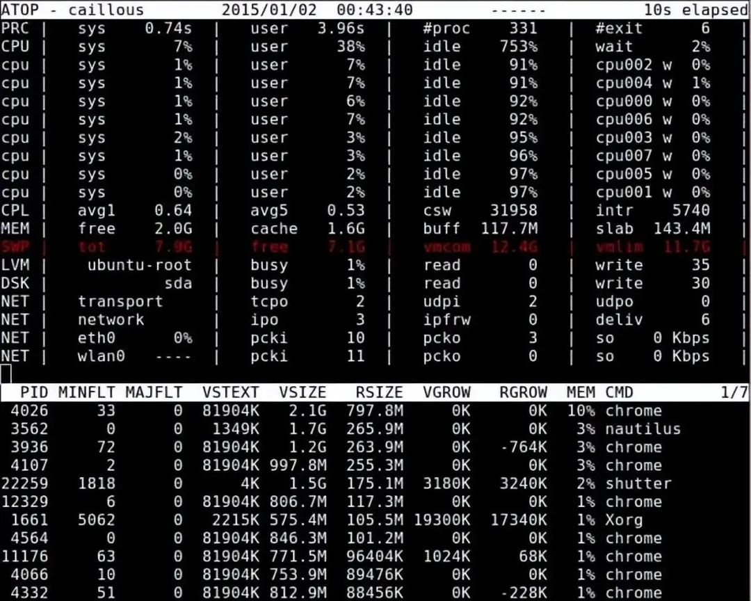 atop命令是一个终端环境的监控命令。它显示的是各种系统资源(CPU, memory, network, I/O, kernel)的综合,并且在高负载的情况下进行了彩色标注。