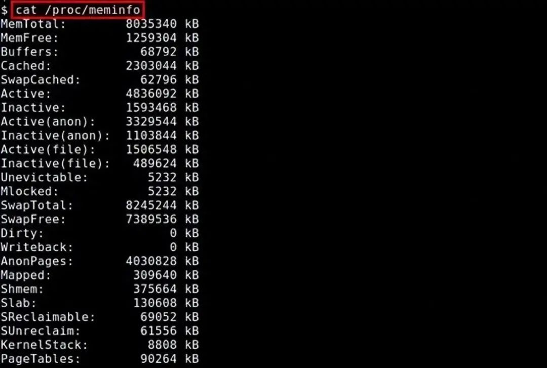 查看RAM使用情况最简单的方法是通过 /proc/meminfo。这个动态更新的虚拟文件实际上是许多其他内存相关工具(如:free / ps / top)等的组合显示。/proc/meminfo列出了所有你想了解的内存的使用情况。进程的内存使用信息也可以通过 /proc/<pid>/statm 和 /proc/<pid>/status 来查看。