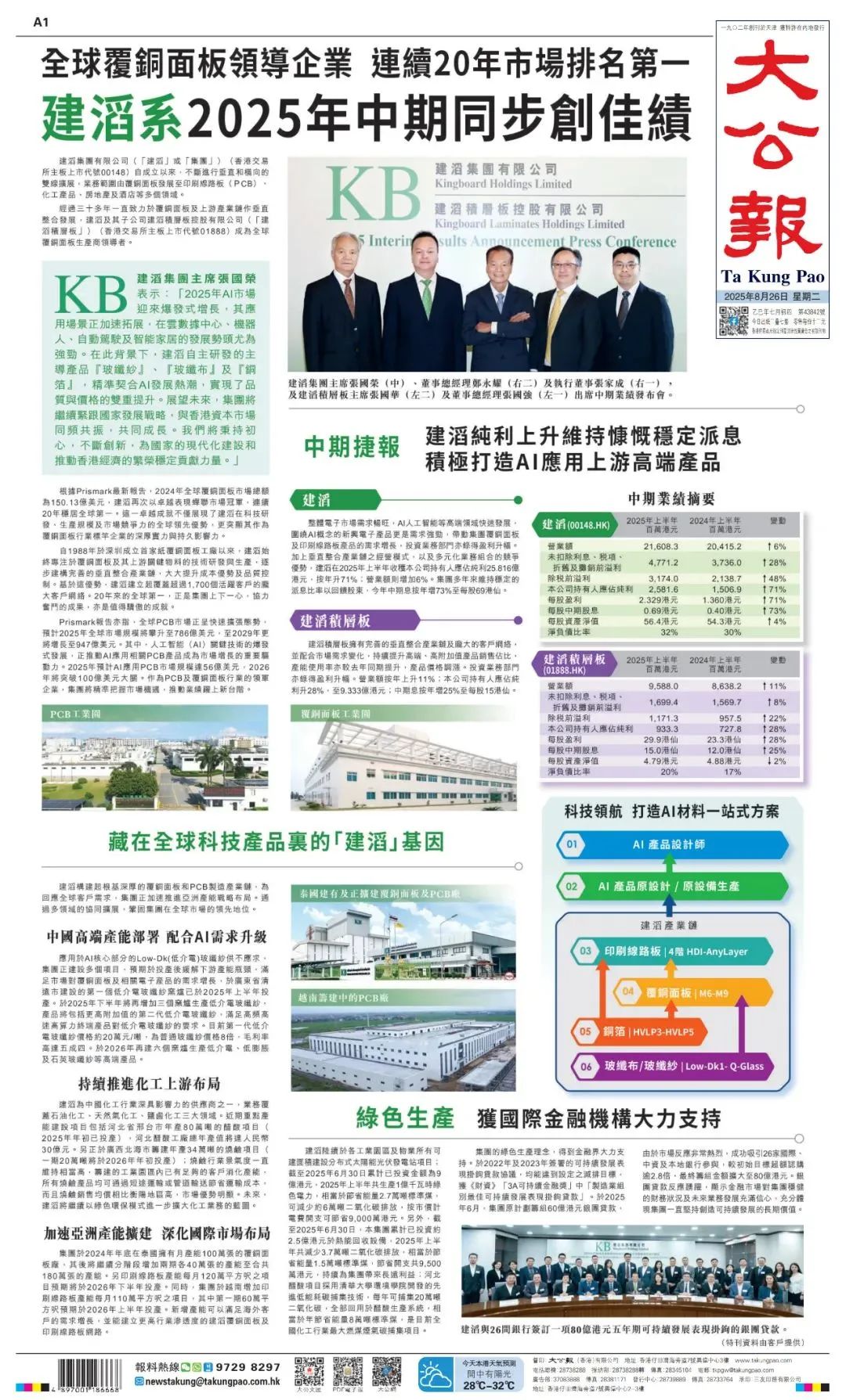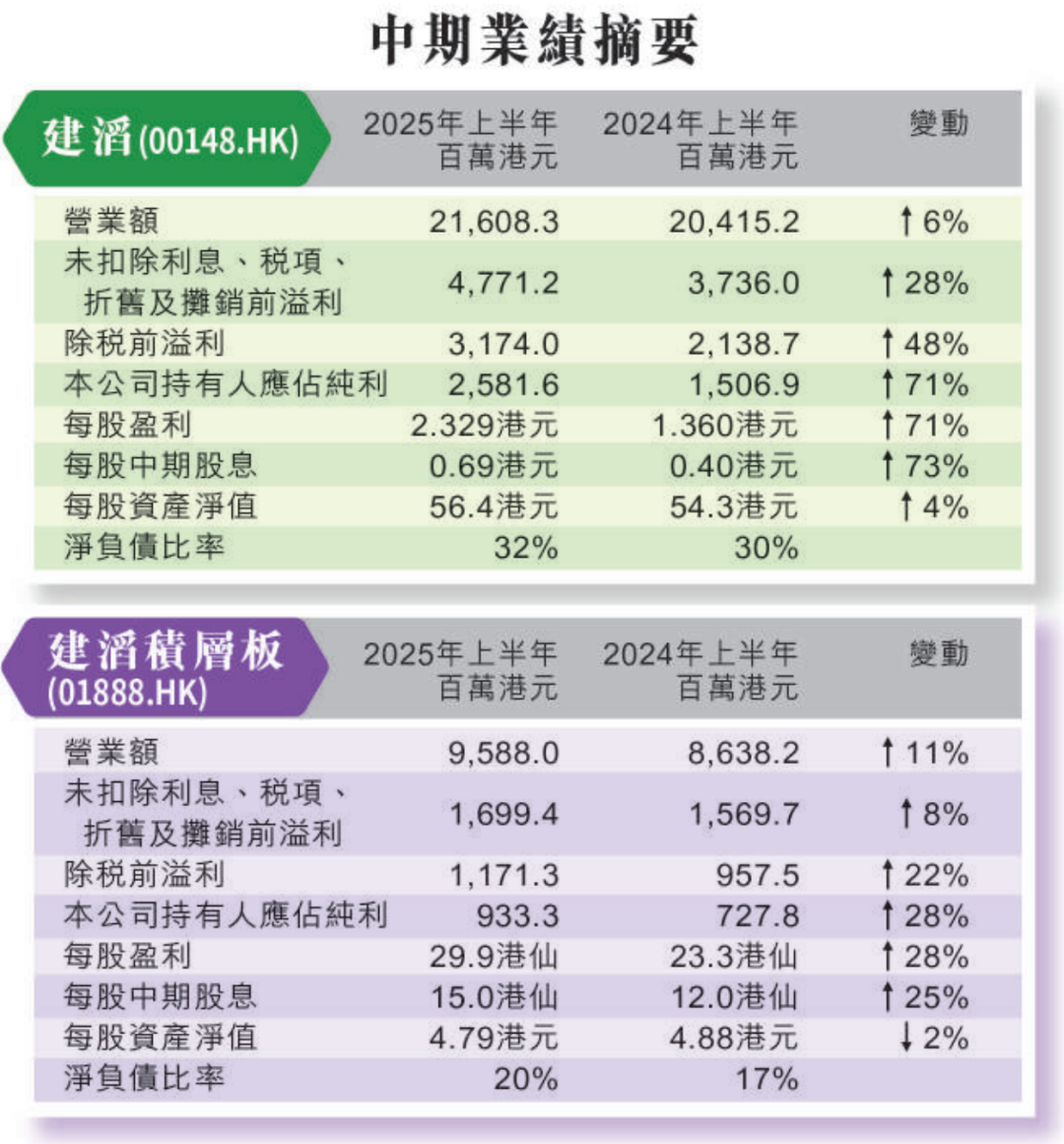 整体电子市场需求畅旺,AI人工智能等高端领域快速发展,围绕AI概念的新兴电子产品需求强劲,带动集团覆铜面板及印刷线路板产品的需求增长,投资业务部门亦录得盈利升幅。加上垂直整合产业链之经营模式,以及多元化业务组合之优势,建滔在2025年上半年录得本公司持有人应占纯利25.816亿港元,按年升71%;营业额则增加6%。集团多年来维持稳定的派息比率以回馈股东,今年中期息按年增73%至每股69港仙。