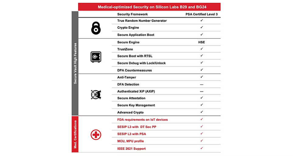 联网医疗设备受到严格的监管与标准化要求,终端设备制造商必须通过大量耗时的认证。芯科科技的蓝牙解决方案能够直接支持主要的医疗合规要求,加速ODM 的营收实现: