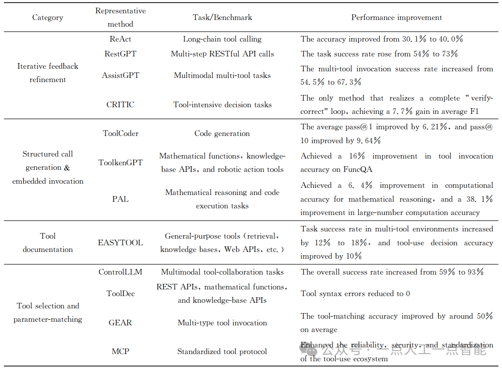 本节围绕迭代反馈优化、结构化调用生成与嵌入式调用优化、工具文档结构化重写、工具选择与参数匹配总结了多种典型优化方案,并将相关的性能改善整理在表2中,以便对不同方法的优化侧重点及效果形成整体认识。