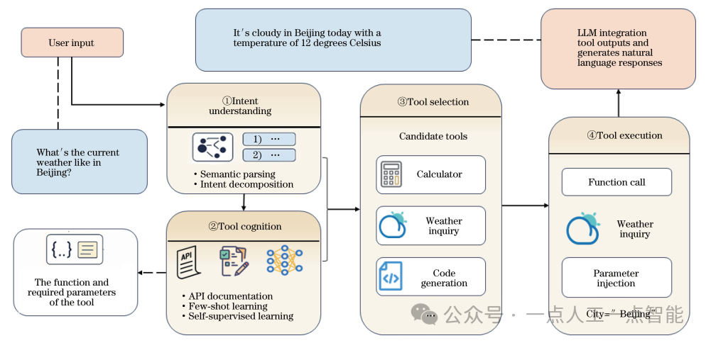 基于对意图与工具的双重理解,随后进入工具决策阶段,通过对不同工具的能力匹配程度、参数需求等因素进行综合权衡,选择最适合当前任务的工具或工具组合。在工具执行阶段,模型依据决策结果向选定的工具注入正确的参数,触发对应的函数调用、接口请求或外部查询,并将工具返回的结果与模型的语言生成能力结合,形成连贯、准确且任务导向的最终输出。