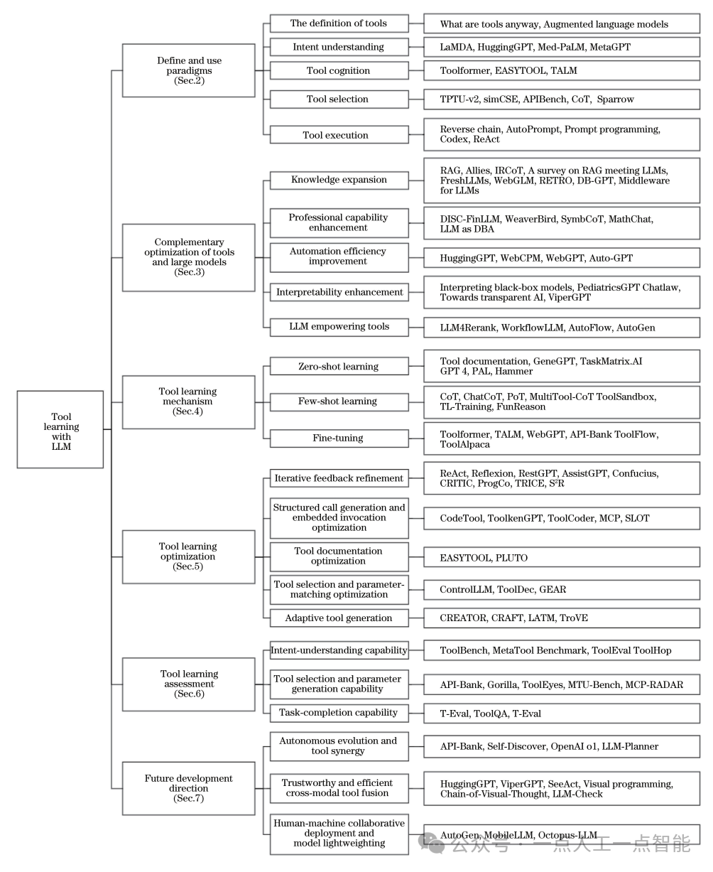 随后,从工具学习机制和工具学习优化两个方面详细分析当前的研究进展,包括基于上下文学习和微调训练的多种工具调用策略,以及如何通过优化手段提高大模型工具调用的准确性、让大模型在特定任务下自主创建新工具等前沿探索。