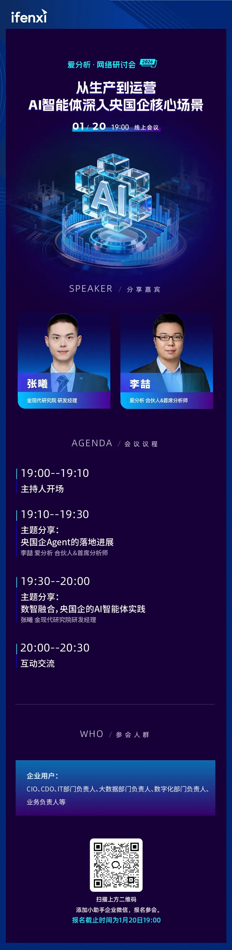 1月20日19:00,爱分析网络研讨会将举办2026年开年第一讲,本次直播围绕央国企Agent的核心落地场景与案例,邀请行业AI专家一起,深入剖析央国企智能体应用的最新进展、共享央国企标杆实践、探讨未来数智化路径。