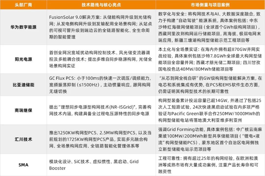 图为:头部阵营构网型储能技术布局,图表源于《行家说储能白皮书:2025电力市场与数智化储能调研报告》