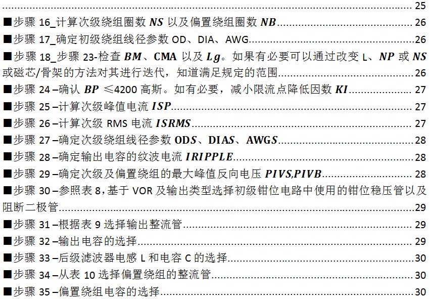 ■步骤18_步骤23-检查Bm、CMA、以及lg。如果有必要可以通过改变L、Np或Ns磁芯/骨架的方法对其进行迭代,知道满足规定的范围