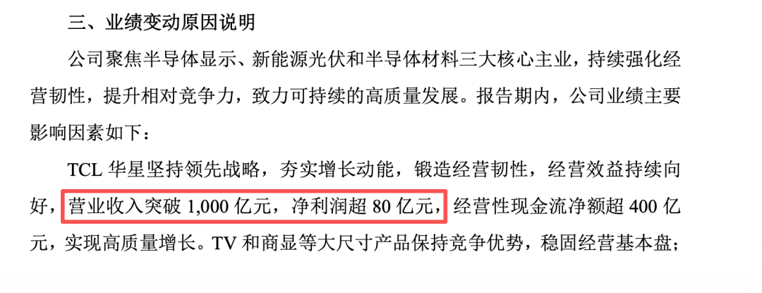 根据公告,TCL科技半导体显示业务增长十分亮眼:预计TCL华星2025全年营业收入将突破1000亿元,净利润超80亿元,经营性现金流净额超400亿元,实现高质量增长。