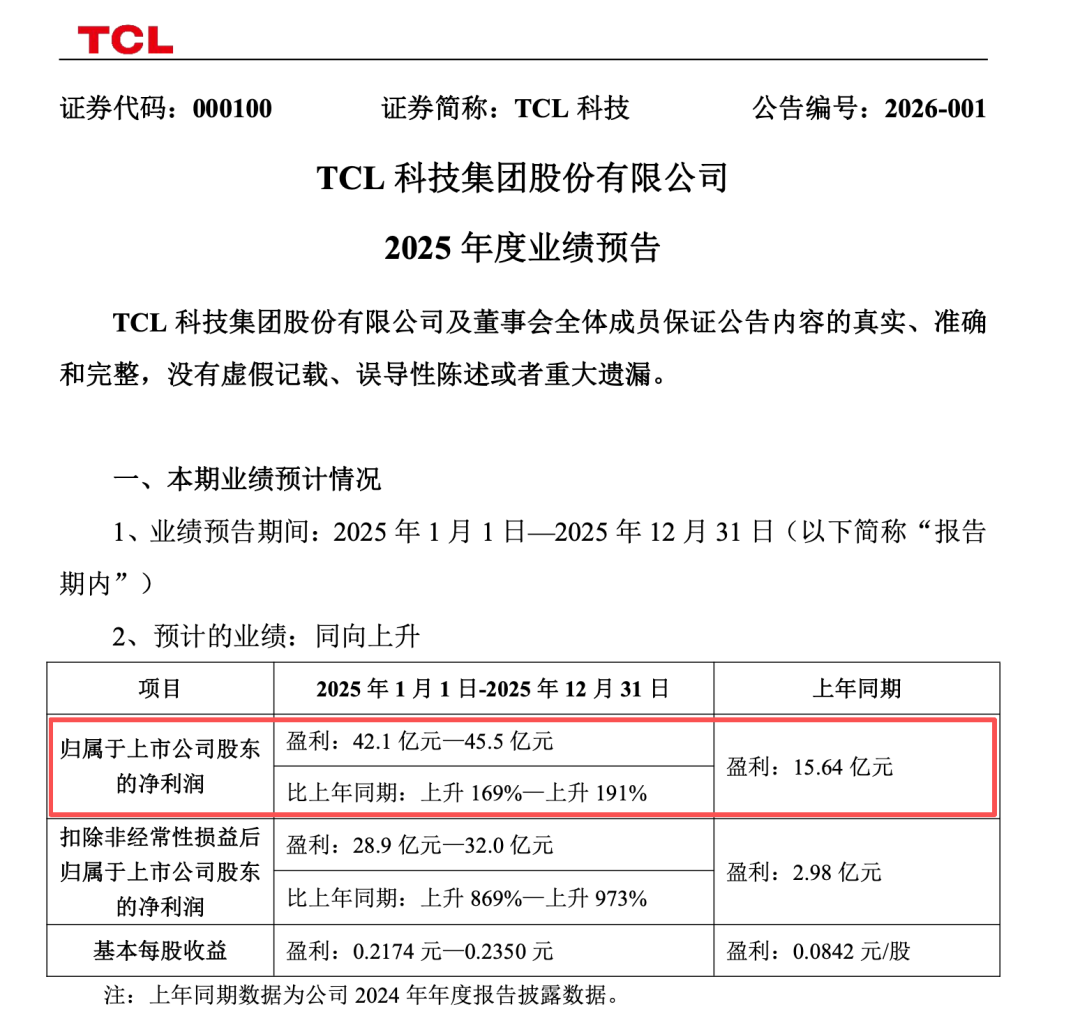 1月13日晚间,TCL科技(000100.SZ)披露2025年度业绩预告,预计2025年归属于上市公司股东的净利润42.1-45.5亿元,同比上升169%-191%;扣除非经常性损益后归属于上市公司股东的净利润28.9-32.0亿元,同比上升869%-973%,盈利能力持续强化。
