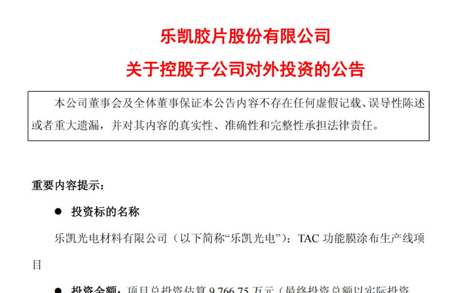 1月13日,乐凯胶片通过公告披露,其控股子公司乐凯光电计划使用自有资金投资建设一条TAC功能膜涂布生产线。该项目位于江苏省宿迁市宿城经济开发区西片区,总投资额约为9766.75万元。该项目的建设周期预计为24个月。