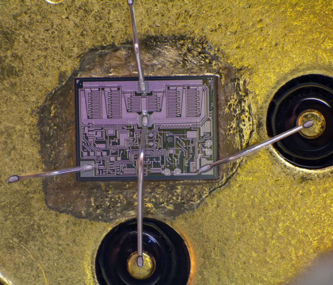 拆开金属圆帽封装后,就能看到内部的裸片、肉眼可见的复杂电路,以及连接裸片焊盘与外部引脚的键合线。