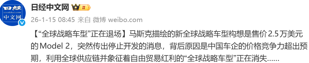 电动知家消息,2026年1月15日,据日经中文网报道,美国纯电动汽车(EV)巨头特斯拉已停止开发低价的全球战略车型Model 2。这款定价预计2.5万美元的平价电动车项目被终止,标志着特斯拉战略重心从“制造大众买得起的电动车”全面转向自动驾驶出租车和人工智能领域。