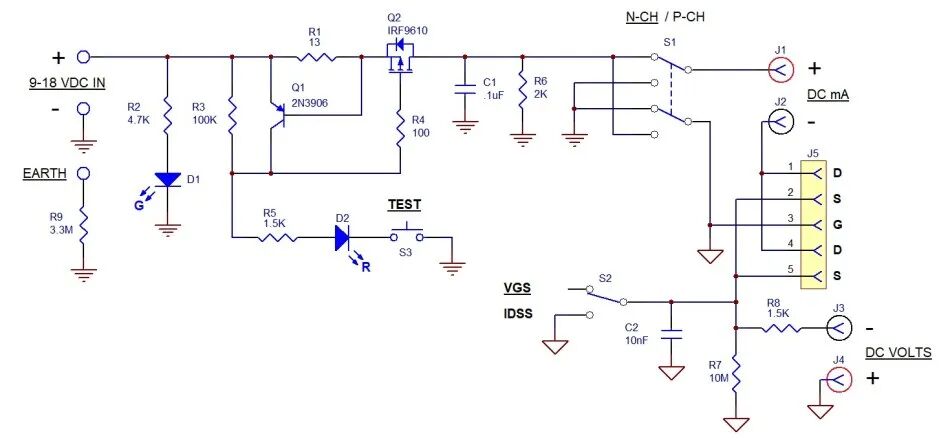 S3做为电源开关,向极性反转开关S1提供电源,而S2则用来选择测量类型。J1与J2是设定为测量漏极电流的DMM用香蕉插头;J3与J4则是设定为测量Vgs(off)的DMM用香蕉插头。