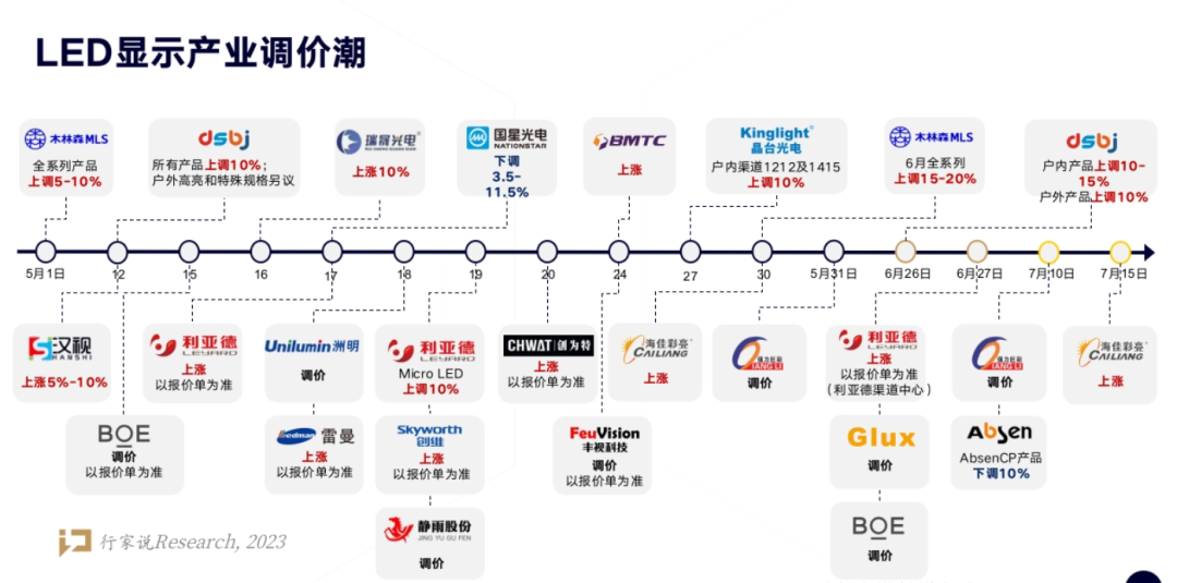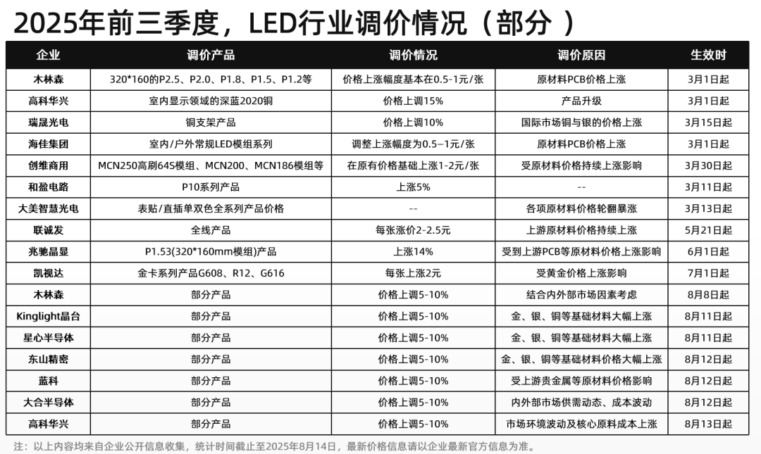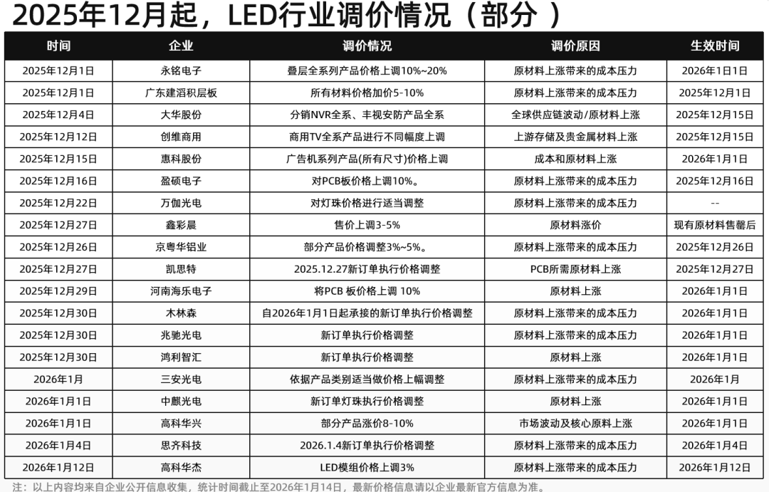 这三轮涨价潮均呈现出“企业联动、全链波及”的鲜明特征,累计覆盖产业链内数十家核心企业,既包括木林森、高科华兴等中游封装企业,也辐射上游材料与下游终端环节的诸多厂商。