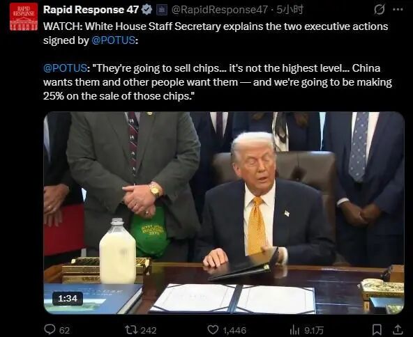 “这些芯片不是最高水平,但非常好,”特朗普当天在签署仪式上对记者声称,“中国想要它们,其他人也想要,我们将从这些芯片销售中获得25%的收入,事儿就是这么回事儿。”