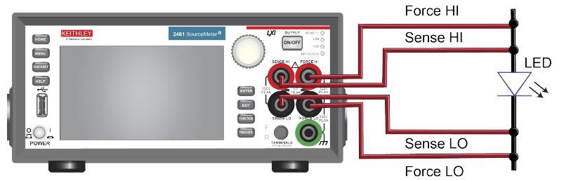 为了获得最佳测量精度,并在输出大电流时消除测试线电阻带来的影响,建议使用四线感测(4-wire sense)方法将2461连接到被测器件(DUT)。