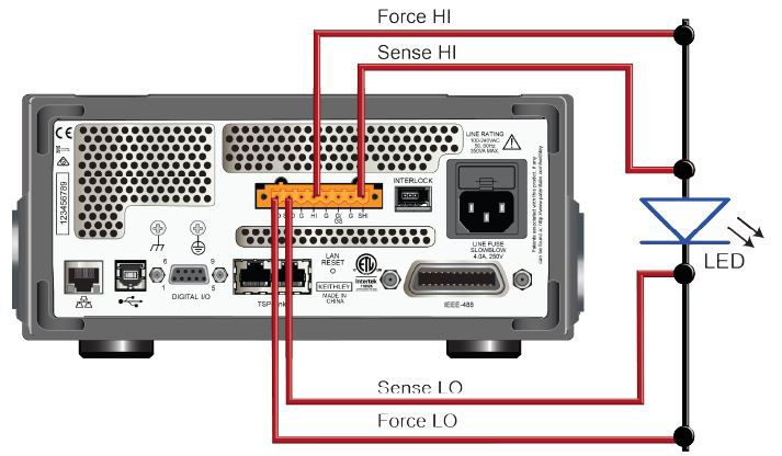 ■ 将FORCE HI和SENSE HI测试线连接至LED的阳极(anode)端