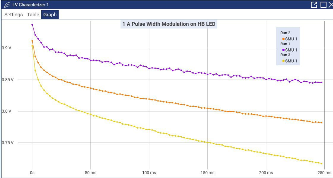 在本示例中,你将使用KickStart软件将2461配置为输出不同的脉冲电流波形。每一次运行都会设定相同的周期,但应用不同的占空比。测试结果中,电压随时间变化将显示在图表中,所有运行实例将被同时选中,以便进行对比分析。