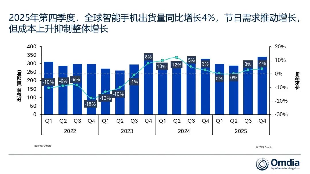 Omdia最新研究,2025年第四季度,全球智能手机市场同比增长4%,这一增长得益于季节性需求回升和库存管理改善,尽管部分厂商开始受到零部件成本上升的影响。增长主要集中在头部厂商,包括苹果和三星,在关键地区表现突出。苹果以25%的市场份额领跑全球智能手机市场,得益于iPhone 17系列需求强劲,季度出货量创下历史新高,同时连续三年成为全球最大的智能手机厂商,小幅领先三星。