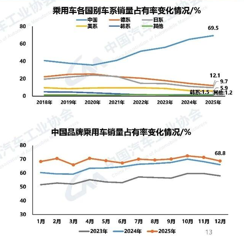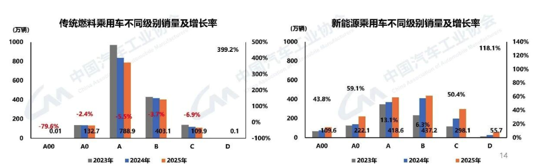 数据显示,2025年中国品牌乘用车年销量达到 2093.6万辆,同比增长 16.5%。更具标志性意义的是,中国品牌的市场份额已攀升至 69.5%,较2024年提升了4.3个百分点。而2012年这个数字是反过来的,中国品牌汽车占比不到30%,而外资品牌占比超70%。这意味着,合资品牌在中国市场的份额已被压缩至30%左右。曾几何时我们讨论的“50:50”攻守线早已不仅是被突破,而是被彻底重构。从细分数据看,传统燃料乘用车销量主要集中在10-15万区间且呈下降趋势,而中国品牌凭借在新能源领域的先发优势,正在从A级、B级市场向高端市场进行全方位渗透。对于合资车企而言,2025年是艰难的一年;而对于中国品牌,这是从“跟随者”彻底转变为“主导者”的历史性分水岭。但是Vehicle之前文章《大象转身的韧性与代价:大众汽车集团2025年全球和中国业绩深度点评》提到的大众,从2026年开始已经集合本土力量准备好了强大的适合本土的新能源智能化产品攻势,或许26年会有个焦灼和变数的状态。二、 动力变革:新能源的“半壁江山”与混动的“出海红利”