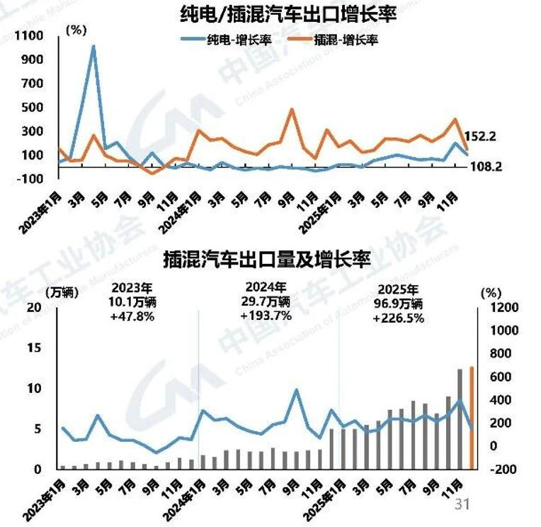 新能源汽车的增长不再是新闻,但2025年的数据依然不仅是量的积累,更是质的飞跃。渗透率临界点:2025年全年新能源汽车产销突破 1600万辆,销量达到 1649万辆,同比增长 28.2%。全年新能源新车销量占比达到 47.9%,而12月单月的渗透率更是突破了 52.3%。这表明,燃油车作为少数派的时代已经实质性开启。市场集中度极高:新能源市场的头部效应愈发明显。排名前十五的企业集团新能源销量合计占总量的 95%。其中,比亚迪一家独大,年销460.2万辆,占据 27.9% 的市场份额。市场已进入“寡头竞争”的初级阶段。插混的出海爆发:值得注意的是,在出口端,虽然纯电动汽车出口量164.6万辆仍高于插混,但插电式混合动力(PHEV)的出口增速惊人,达到了 2.3倍,全年出口96.9万辆。这里表示,在全球基础设施尚不完善的背景下,叠加欧盟对电动车的加税政策,PHEV正成为中国车企攻占海外市场的“特种部队”。三、 全球化征程:700万辆背后的“隐忧”与“转型”