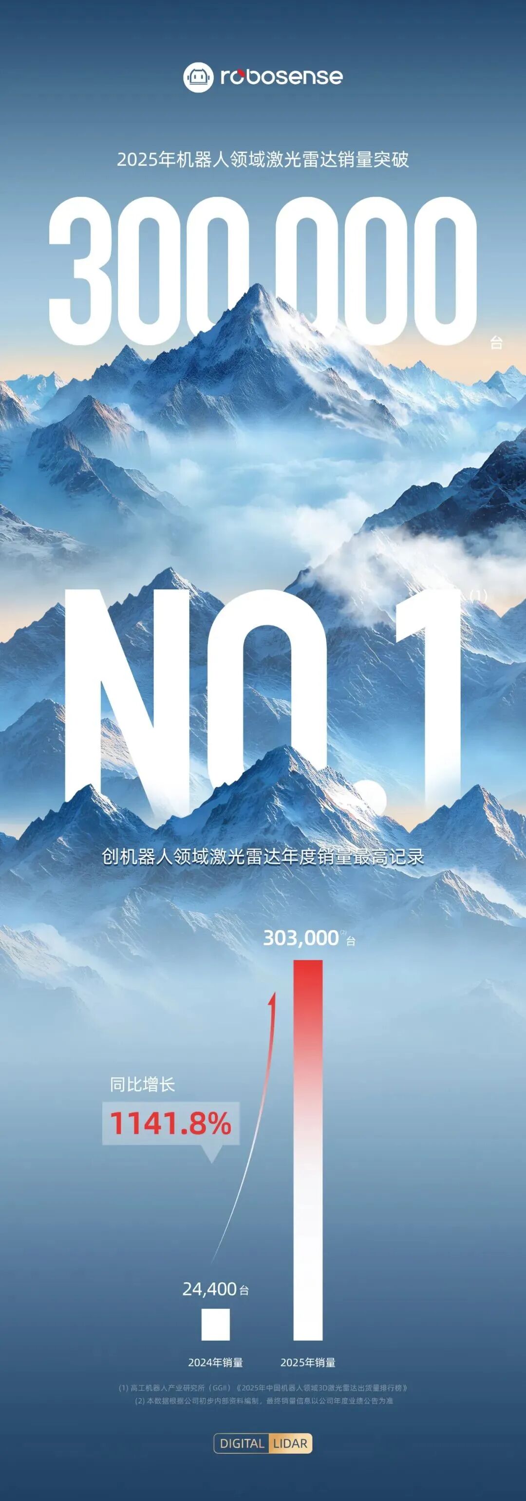 麦姆斯咨询获悉,1月13日,速腾聚创(RoboSense)宣布,2025年机器人领域激光雷达(LiDAR)产品销量达303,000台,问鼎行业第一。相较2024年,速腾聚创(RoboSense)机器人领域产品销量同比强劲增长1141.8%。