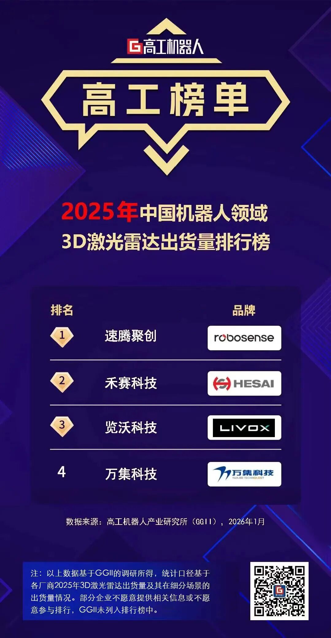 据高工机器人产业研究所(GGII)《2025年中国机器人领域3D激光雷达出货量排行榜》显示,速腾聚创(RoboSense)2025年机器人业务增速迅猛,激光雷达年出货量位居行业第一;禾赛科技、览沃科技、万集科技位列第二至第四。GGII预测,在割草机器人、人形/四足机器人等市场的带动下,3D激光雷达市场规模将实现高速增长,预计到2030年达到近45亿元,2025-2030年复合增长率约35.52%。