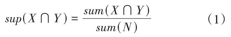 式中:sup(X ∩Y) 为X 和Y 同时出现的支持度,sum(X ∩Y)为X和Y同时出现的频数,sum(N)为总项集的频数。