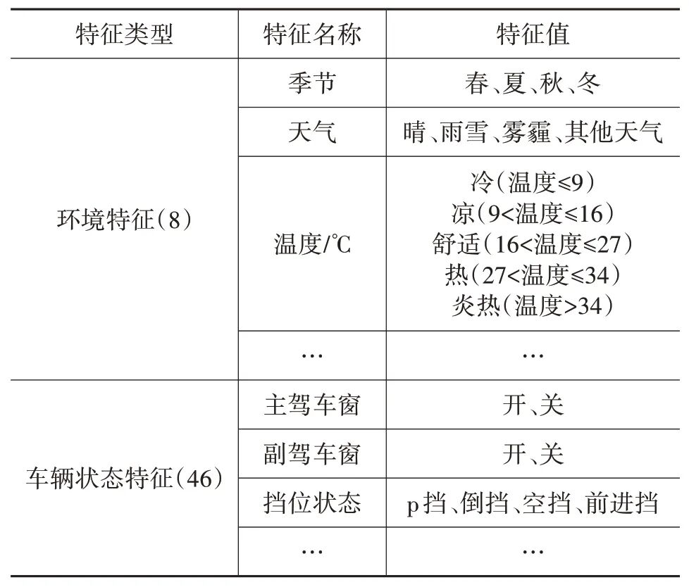 本文的原始数据来自某项目车型的埋点数据,获取数据之前均与用户签署隐私协议,主要数据为2.1.1中提及的车机信号数据和环境数据,包含2024 年6 月28 日至2024 年7 月27 日共30 天活跃车辆的行程记录,日活跃车辆数均超过30 000 辆。经数据清洗后,提取情境特征和车控行为。其中,情境特征反映场景在一段时间内的持续属性和特点,车控行为是瞬时的动作或反应。同时,剔除重复度较高、分布极不均衡以及对车控行为无影响的特征。