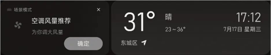 为了进一步验证无监督场景生成技术的实际应用价值,本研究在台架上进行测试。搭建的测试环境主要由中央显示屏和驾驶环境模拟软件组成。将无监督场景生成模型部署在测试环境中,配置软件参数创建虚拟环境,重点设置天气条件。在上车阶段,当前温度设置为31 ℃(特征“温度=热”),中央显示屏弹出场景模式卡片,推荐内容为“空调风量推荐——为你调大风量”(见图4)。测试结果说明,无监督场景生成模型能根据特征自主挖掘关联行为,生成场景,给用户提供智能推荐。
