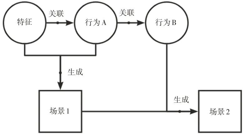 在车载交互领域,场景是指参与者、环境、目标和目的、行动和事件的顺序,以及假设的上下文描述[9]。本研究中的场景是指结合了情境特征和驾乘人员行为的整体描述。通过模型挖掘出特征与行为、行为与行为的关联关系,自动生成有实际应用价值的场景(见图2)。