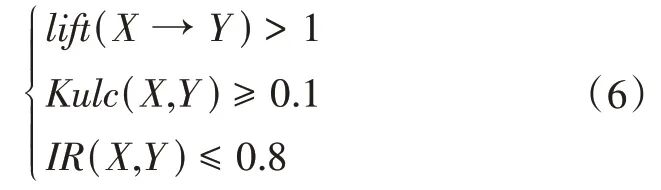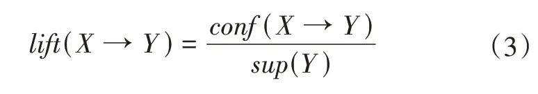 式中:lift(X →Y)为X 和Y 的提升度。lift>1 且越高表明正相关性越强,lift<1 且越低表明负相关性越强,lift=1表明没有相关性。