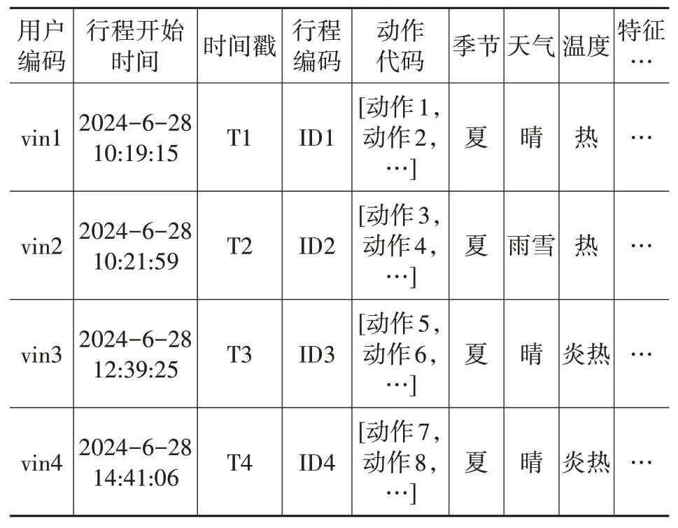 情境特征包含8 个环境特征和46 个车辆状态特征,共计54 项(特征示例见表1);车控行为包含蓝牙、空调、地图、多媒体等19 个领域类别,共计445 个(行为示例见表2),处理得到用户行程操作统一数据模型表(见表3)。