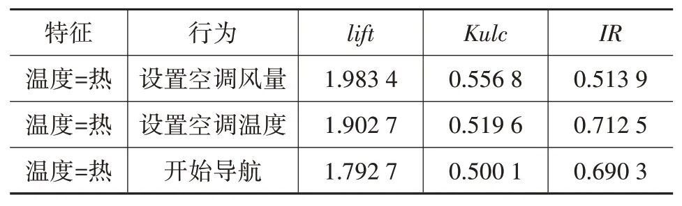 利用无监督场景生成模型挖掘“温度=热”特征的关联行为,运用关联分析计算“温度=热”特征与各个行为的3 个关联指标,指标过滤后的结果如表4 所示。“温度=热”特征的关联行为有3 个,分别为设置空调风量、设置空调温度和开始导航,表示在温度为热的情况下用户有更大可能会进行这3 个操作。“温度=热”与“设置空调风量”的lift 和Kulc 值最大,说明二者关联程度最强,IR 值较小,说明二者样本量差异较小,数据比较平衡。与“设置空调温度”的关联程度次之。设置空调风量和温度的行为意图均为调整车内温度,反映出温度为热状态下用户的主要需求。与“开始导航”存在关联关系,是由于天气较热时,用户出于舒适性考虑,一般会使用导航选择荫凉或者最快的路线。“温度=热”特征与这3 个行为生成通用场景,当温度范围为27~34 ℃,可以为用户推荐设置空调风量、设置空调温度、开始导航,其中设置空调风量可作为优先推荐。