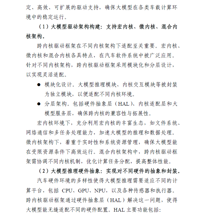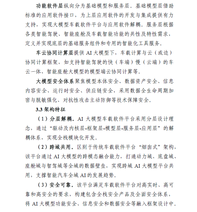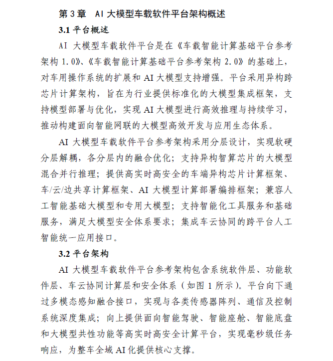 本项白皮书的AI大模型车载软件平台参考架构,是基于《车载智能计算基础平台参考架构1.0/2.0》在AI大模型技术领域的扩展,具备以下特点: