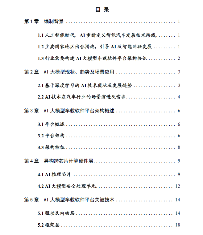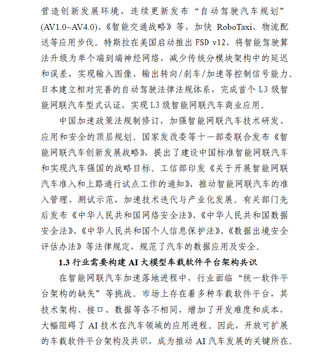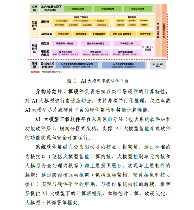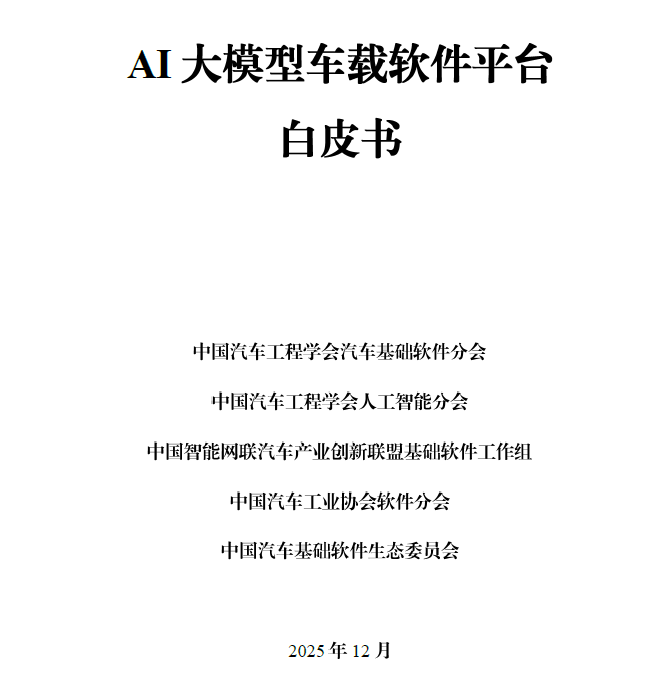 人工智能技术高速发展,AI大模型逐渐应用到汽车各个领域,逐步成为智能网联汽车的核心基础技术。主要国家地区出台措施,引导AI大模型支持智能网联发展。但是,大模型在加速落地进程中,行业面临“统一软件平台架构的缺失”等挑战,行业需要构建AI大模型车载软件平台架构共识。因此,中国汽车工程学会汽车基础软件分会、中国汽车工程学会人工智能分会、中国智能网联汽车产业创新联盟基础软件工作组、中国汽车工业协会软件分会、中国汽车基础软件生态委员会等行业组织联合牵头,由李骏院士、李克强院士领衔指导,国家智能网联汽车创新中心、清华大学、复旦大学、电子科技大学、重庆大学、北京工业大学、紫金山实验室、合肥综合性国家科学中心、一汽、东风、长安、北汽、上汽、广汽、奇瑞、一汽解放、比亚迪、蔚来、理想、科大讯飞、华为、中兴通讯、超星未来、黑芝麻智能、杰发科技、零束、魔门塔、北京数字基建、德赛西威、镁佳、中汽创智、斑马智行、中瓴智行、普华基础软件、经纬恒润、东软睿驰、西门子中国等行业30+家单位共同研究《AI大模型车载软件平台白皮书》,提出AI大模型车载软件平台参考架构。