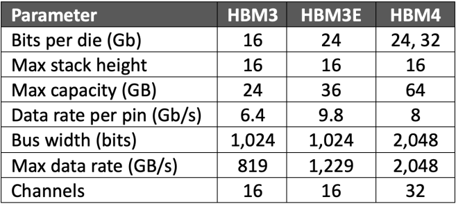 同时,作为衡量性能的核心指标,内存总带宽的提升既可以依靠拓宽接口位宽,也能通过提高单引脚的信号传输速率来实现。HBM4不仅拓宽了接口位宽,还将通道数量增加了一倍。其单引脚信号传输速率也高于HBM3,但略逊于HBM3E。