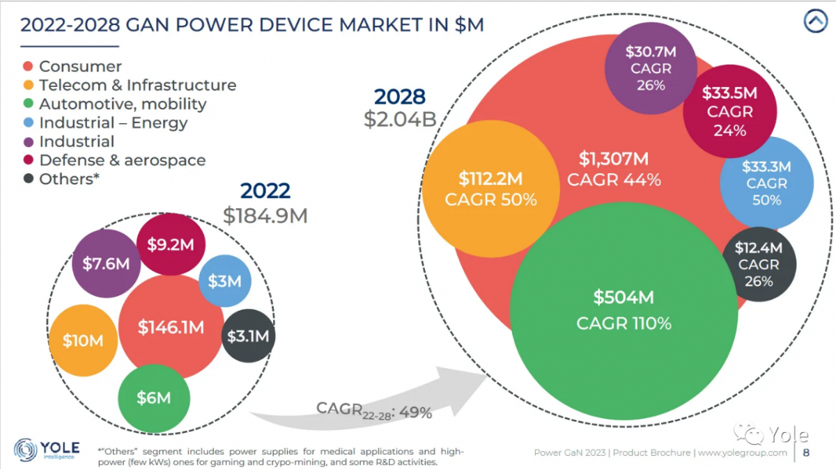 作为宽禁带半导体家族中的一员,氮化镓(GaN)功率器件近两年获得了比之前更高的关注度,正逐渐成为第三代半导体材料中最耀眼的一颗新星。根据Yole预测,到2028年,GaN功率器件市场的价值将从2021年的1.26亿美元增长到20.4亿美元,年复合增长率高达49%,消费电子、汽车、电信、数据通信等应用对其青睐有加。